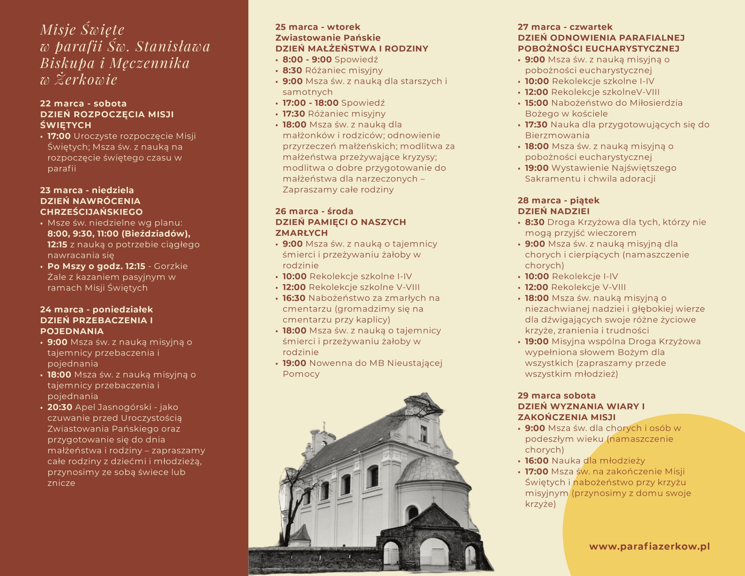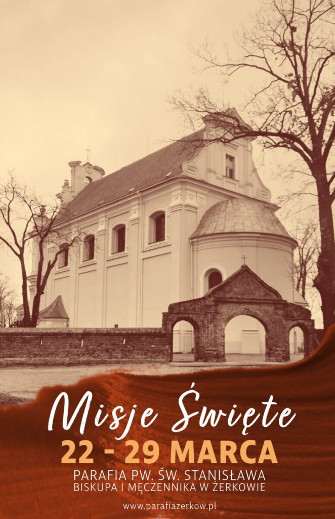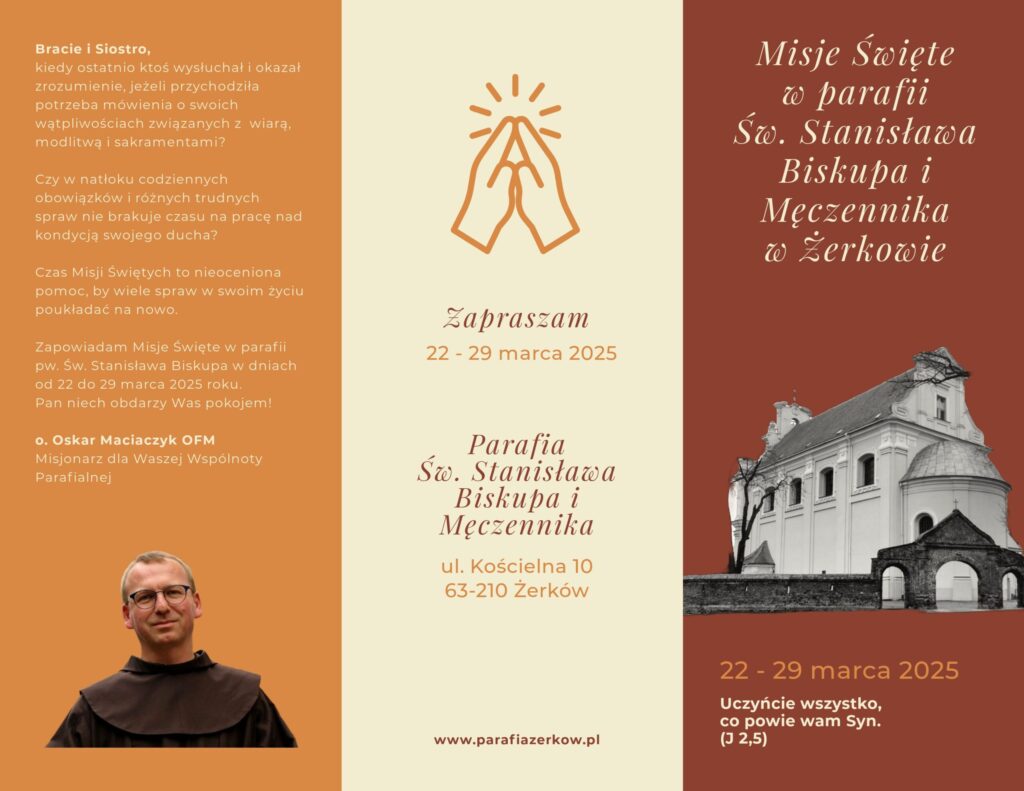 Czcigodny Księże Proboszczu oraz Drodzy Bracia i Siostry w Chrystusie, którzy tworzycie wspólnotę parafialną pw. Św. Stanisława Biskupa w Żerkowie, tym listem zapowiadam jako misjonarz bardzo ważne wydarzenie w Waszej Parafii – Misje Święte. Odbędą się one w dniach od 22 do 29 marca 2025 r.